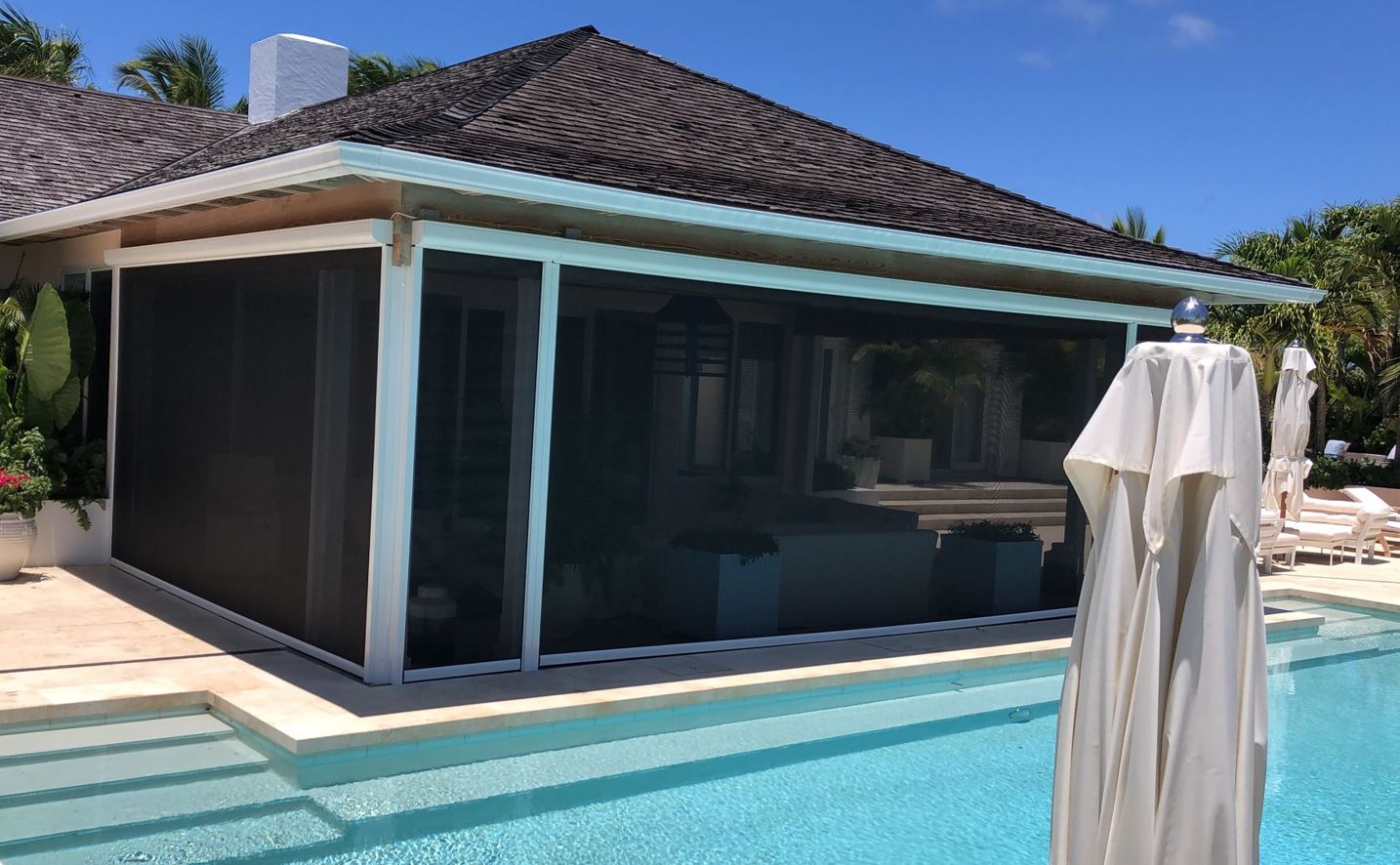 From the outside view, the motorized clear ‘see through’ insect screens look elegant as they provide protection from all bugs and maintains the aesthetic appeal of your home.